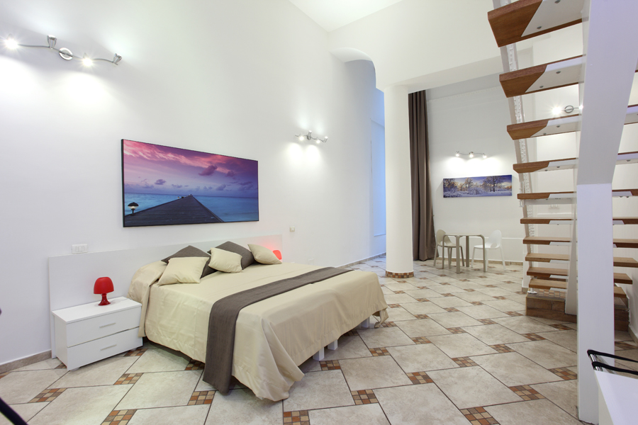 La Suite su due livelli si presenta molto accogliente e spaziosa, difatti è divisa su 2 livelli da 50 metri/quadri, uno superiore e uno inferiore, arredata in stile moderno, molto luminosa grazie all’illuminazione a led e anche alla presenza di un antico finestrone che irradia la stanza dalla luce naturale del sole.